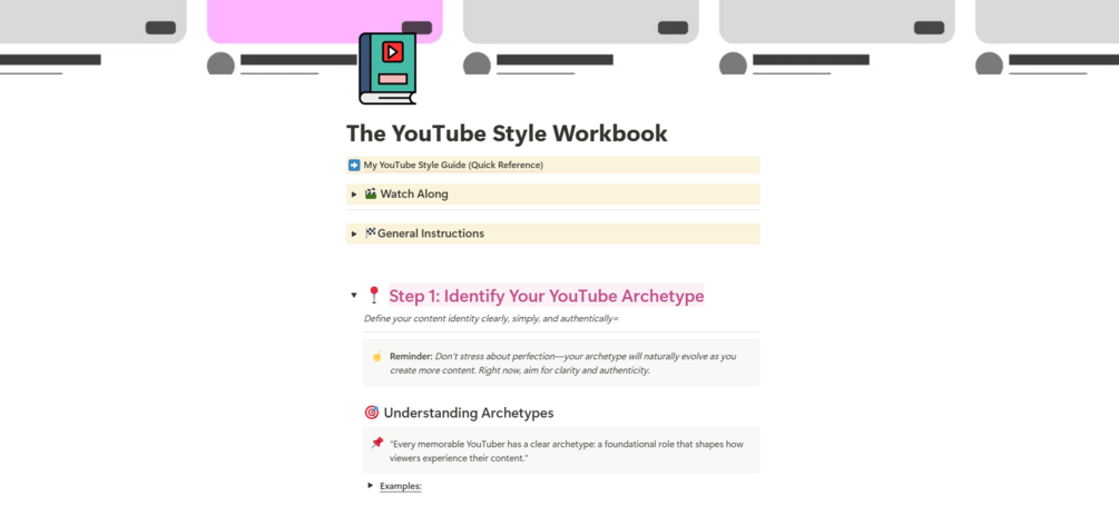 A Notion template that walks you through the formation of your own YouTube style, from archetype creation to visual style, rhythmic style, and delivery style, to help you create your own unique YouTube identity.